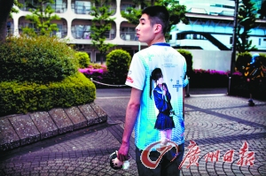 男子穿着印有虚拟女友照片的T恤上街。