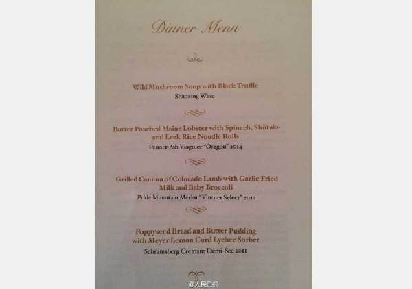 白宫官方提供的菜单显示,为客人提供的开胃菜是野蘑菇黑松露汤,佐以中国传统的绍兴黄酒。