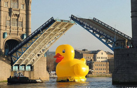 你或许不知道,“冷萌”的英国人曾在2012年12月,特意为一只高15.24米,重达半吨的巨型小黄鸭开启伦敦塔桥,这种玩儿法实在很英国。