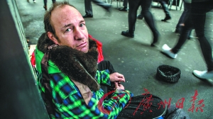 墨尔本市区一名乞丐在沿街乞讨。