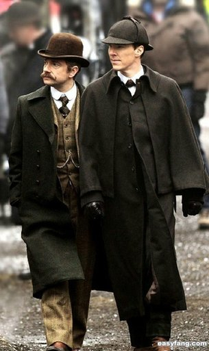 海报和预告片中两位主演的服装已经充满了时代感:三件套、大披风、烟斗和标志性的猎鹿帽。据报道为了符合这一时代背景的设定,福尔摩斯身上那些高科技玩意都得被拿走,例如他的重要工具iPhone。