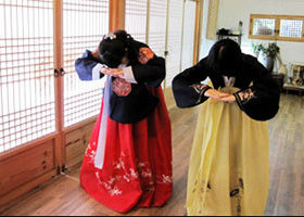 韩国极重礼仪,尤其在长尊有序上体现明显。比如上菜或盛饭时,先要递给长辈,甚至要特设单人桌,由女儿或媳妇恭敬地端到他们面前。席上倒酒,亦需要按年龄大小顺序,由长至幼,长辈举杯之后,晚辈才可以饮酒。