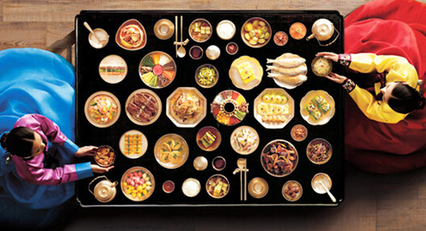 韩国饮食也以米饭为主食,大大小小的盘子供一桌人享用。同时与中韩食物都比较重视健康和外在的精致。