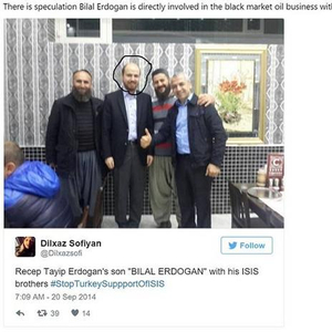 俄罗斯战机被击落后,一张照片风靡社交媒体。照片上是土耳其总统埃尔多安的儿子比拉尔和三名男子在一家餐厅合影,其中有两人蓄着大络腮胡子。这两人被指称是IS头目,曾参与在叙利亚霍姆斯和伊库尔德自治区的屠杀行动。
