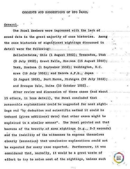 其中一份,是1952年科学顾问委员会对于不明飞行物报告的评估和建议。科学顾问委员会列举了1952年的数次UFO目击事件,得出结论称,对于大多数目击而言,可以给出合理的科学解释,因此,经过推理和科学方法推断可以断定,其他一些目击事件也是类似情况。