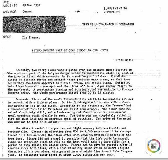 第二份,来自50年代初期的比属刚果,也就是现在的刚果(金)。在南部一座铀矿附近,有目击者称看到了两个盘状飞行物,以“优雅的曲线”飞行,不断变换方位。听到报告,一位名为皮雷的空军指挥官驾驶飞机从附近一座机场起飞追赶。别说,还真追到了。