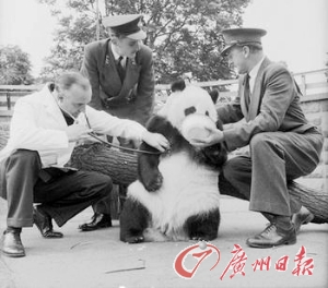 1961年,兽医为初到英国的大熊猫“姬姬”体检。“姬姬”是WWF标志的原型。