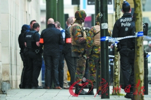 当地时间2016年3月24日,比利时布鲁塞尔,比利时警察和士兵在布鲁塞尔议事厅外巡逻。