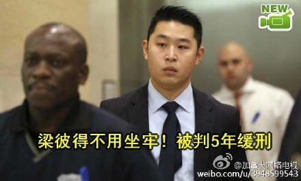 当地4月19日,负责审理梁彼得案的法官Danny Chun宣布,判处梁彼得5年缓刑,外加800小时社区服务。梁彼得律师沙克曼在审判后接受记者采访时表示,今天的审判结果只是往前迈了一步,但这个案件 远没有结束,因为梁彼得不该被定罪。律师已经代表梁彼得当庭提交上诉材料,预计6-8个月后受理。2014年11月20日,与同是新人的队友一起巡逻的警 察梁彼得在黑暗中扣动了手枪扳机,子弹打到墙壁后反弹击中黑人阿凯·格雷,致格雷死亡。央视记者 (殷翔宇 朱海青)