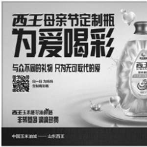 2016年初,作为国内知名食用油品牌西王,于母亲节特别推出定制版油瓶, 此活动再次成为市场焦点,消费者表示:之所以会选择西王胚芽油送礼,不单单是因为妈妈能收到专属的爱心油瓶,更重要的是西王玉米胚芽油让消费者放心,被消费者逐渐认可。