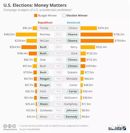 据Statista公司的统计显示,自1976年吉米-卡特募款数额不及对手却成功当选总统以来,总统大选最后的获胜者总是募款最多的候选人。参照8月31日的数据显示,特朗普募得的竞选资金远落后于克林顿。