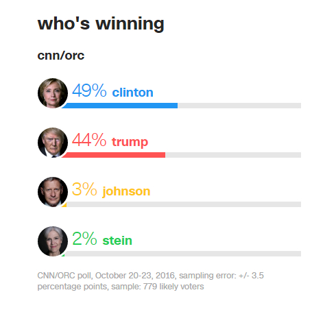 美国总统大选倒数两周,根据10月24日最新出炉的CNN民调,民主党总统候选人希拉里已经拿下49%的支持率,领先共和党总统候选人特朗普的44%。