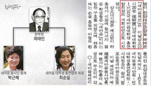 1974年,朝鲜间谍刺杀了朴槿惠的母亲陆英修。艰难时刻,把佛教、基督教、天道教杂糅在一起创立“永世教”的崔太敏登场了。崔太敏拥戴时任总统朴正熙的长女、代行“第一夫人”的朴槿惠,利用关系大敛钱财。