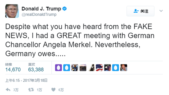 简单来说就是,当地时间3月18日,特朗普在自己推特上连发两个帖子称,“不管你从那些假新闻中听到了什么,反正我和德国总理默克尔有一次非~~~常愉快的会晤。不过,德国还是欠北约和美国一笔巨款,我们必须得到更多支付,因为给德国提供了非常昂贵的国防保护。”