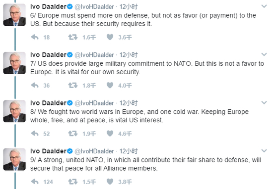 美国前驻北约大使Ivo Daalder连发9条推特解释何为国防开支、何为北约“会费”: