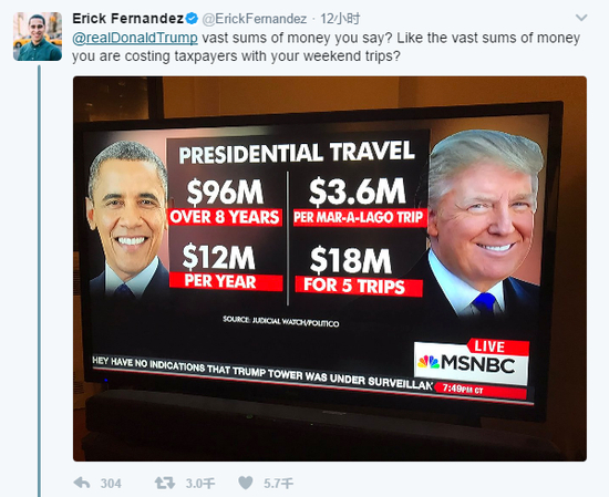 图片比较特朗普和奥巴马任期内的旅行花销,奥巴马8年内用花费9600万美元的旅行支出,而特朗普每次去他位于佛罗里达州别墅的行程是360万美元,上任2个月共5次,花费1800万美元。