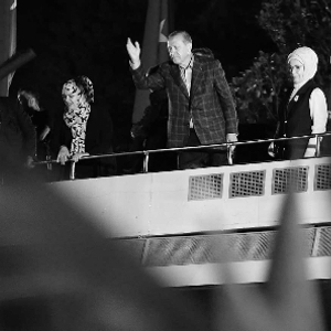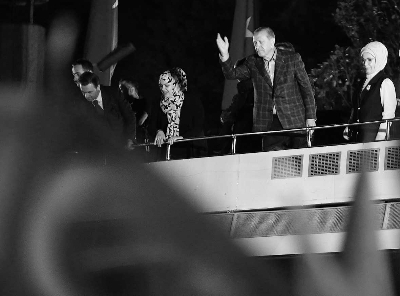 当地时间16日,土耳其总统埃尔多安与夫人(右一)出席集会,向支持者挥手示意 |