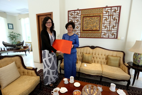 这次采访,阿伦公主特别邀请了她的丈夫盖博·拉斯美一并与我们交流。“我和丈夫是在北京领证结婚的,我们的孩子也是在北京出生的!”阿伦公主一开场,就提到了她与中国难舍的情缘。当被问到去过多少次中国时,阿伦公主笑着说这个可没数过,因为次数太多了,但她清晰地记得1982年是她第一次到访中国,她与丈夫也是在北京举办的婚礼。公主曾多次到北京看望西哈努克太皇和莫尼列太后,也曾去过西安、大连、天津、广州等城市。即使是在柬埔寨驻马来西亚大使的任上,公主也会时常利用周末的时间去北京。她说中国很大,很愿意去走走看看。