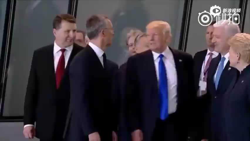 当天,与会领导人齐聚北约新总部大楼交接仪式,准备拍一张大合影。几位领导人正聊着,特朗普一手把前面的黑山共和国总理马尔科维奇推到一边,自己站到了最前面。