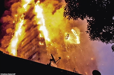 据消防人员介绍,大火是从二楼一直烧到顶楼,整栋大楼都被吞噬。由于担心高楼着火后坍塌,警方已经疏散附近多栋公寓楼的居民。据英国广播公司报道,消防车喷出的水柱最高只能到达10层左右,因此火势难以得到控制。