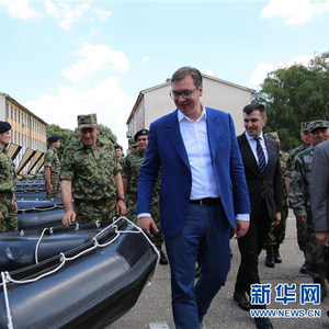 6月20日,在塞尔维亚潘切沃一军营,塞尔维亚总统武契奇(前)参观中国对塞军事援助物资。中国国防部向塞尔维亚国防部捐赠的军事援助物资,20日在位于塞尔维亚潘切沃的斯特维察·约万诺维奇军营进行交接。 新华社记者 王慧娟 摄