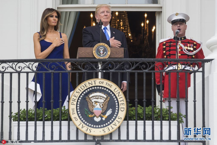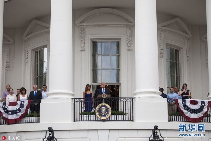当地时间2017年7月4日,美国华盛顿,美国总统特朗普在白宫举办野餐会宴请军人家庭,庆祝美国独立日,并在阳台上发表讲话。(图片来源:东方IC)
