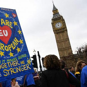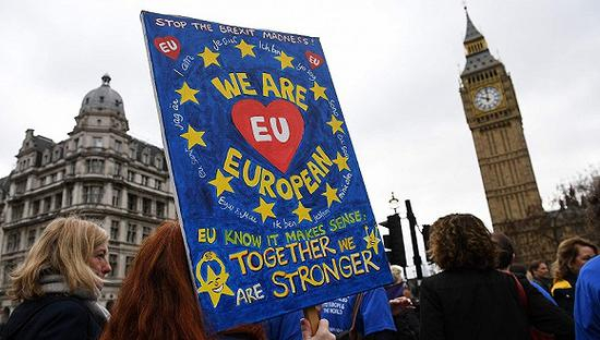 2017年3月29日,英国伦敦,民众聚集议会大楼,组织反脱欧游行。图片来源:视觉中国