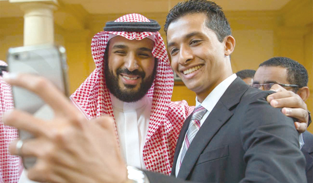 2016年6月17日,美国华盛顿,穆罕默德·本·萨勒曼(左)与一名沙特学生自拍。CFP 供图