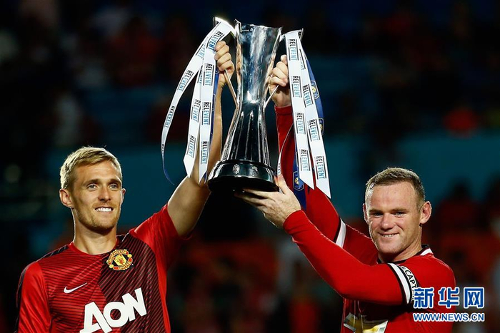 图为2014年8月4日,曼联队球员鲁尼(右)与弗莱彻举起冠军奖杯。当日,在美国迈阿密举行的国际冠军杯决赛中,曼彻斯特联队以3比1战胜利物浦队,夺得冠军。新华社发