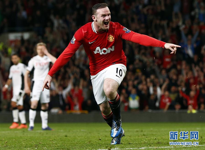 图为2012年3月26日,曼联队球员鲁尼在比赛中庆祝进球。当日,在2011/2012赛季英超联赛第30轮比赛中,曼联队主场以1比0战胜富勒姆队。新华社发