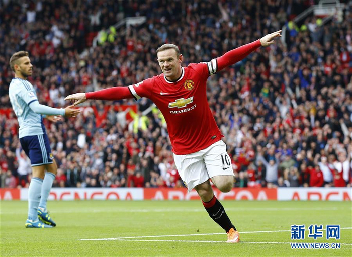 图为2014年9月27日,曼联队球员鲁尼(右)在比赛中庆祝进球。当日,在2014—2015赛季英格兰足球超级联赛第6轮比赛中,曼联队主场以2比1战胜西汉姆联队。新华社发