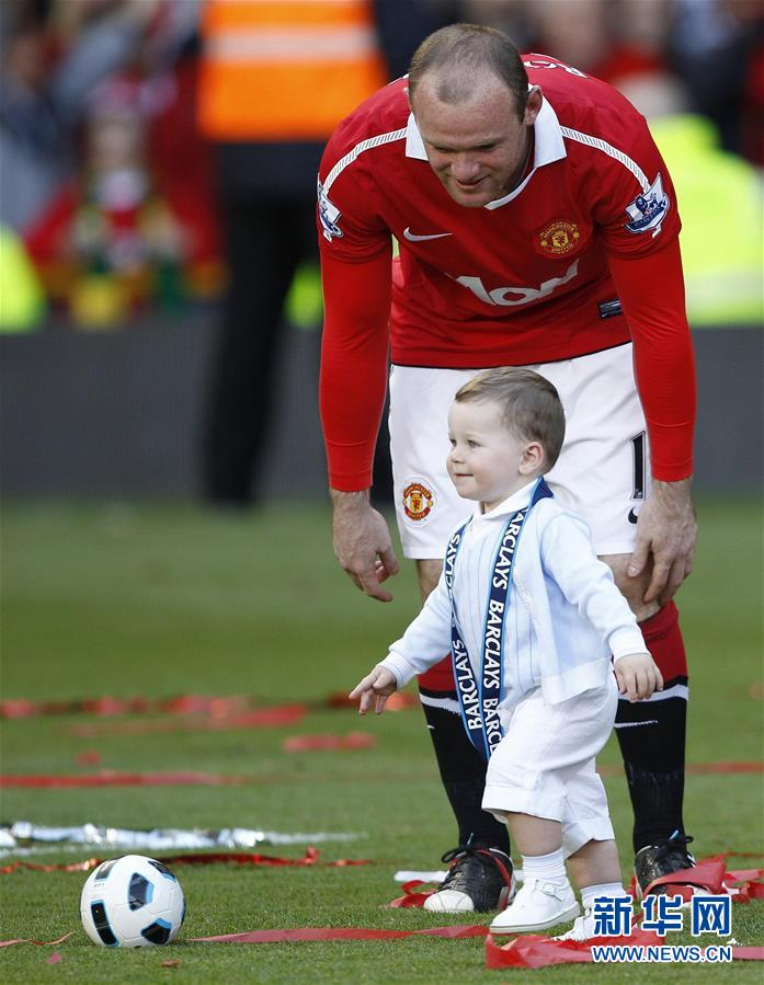 图为2011年5月22日,曼联队队员鲁尼赛后与儿子卡伊在球场内庆祝胜利。当日,2010—2011赛季英格兰足球超级联赛落下帷幕。曼联主场以4比2战胜布莱克浦队,以80分的积分排名积分榜榜首,获得本赛季联赛冠军。新华社发