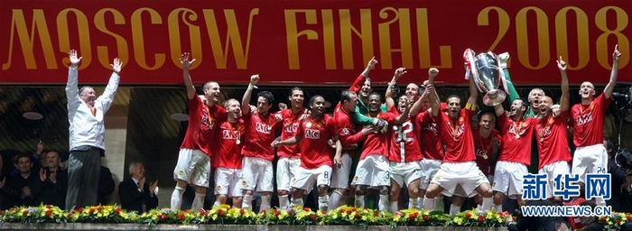 图为2008年5月21日,曼联队球员鲁尼(前左七)与队友在颁奖仪式上欢庆胜利。当日,在俄罗斯首都莫斯科的卢日尼基体育场举行的欧冠联赛决赛中,曼联队与切尔西队在比赛中战成1比1平后,在点球大战中曼联队以6比5战胜切尔西队,捧得冠军奖杯。新华社记者 沈伯韩 摄