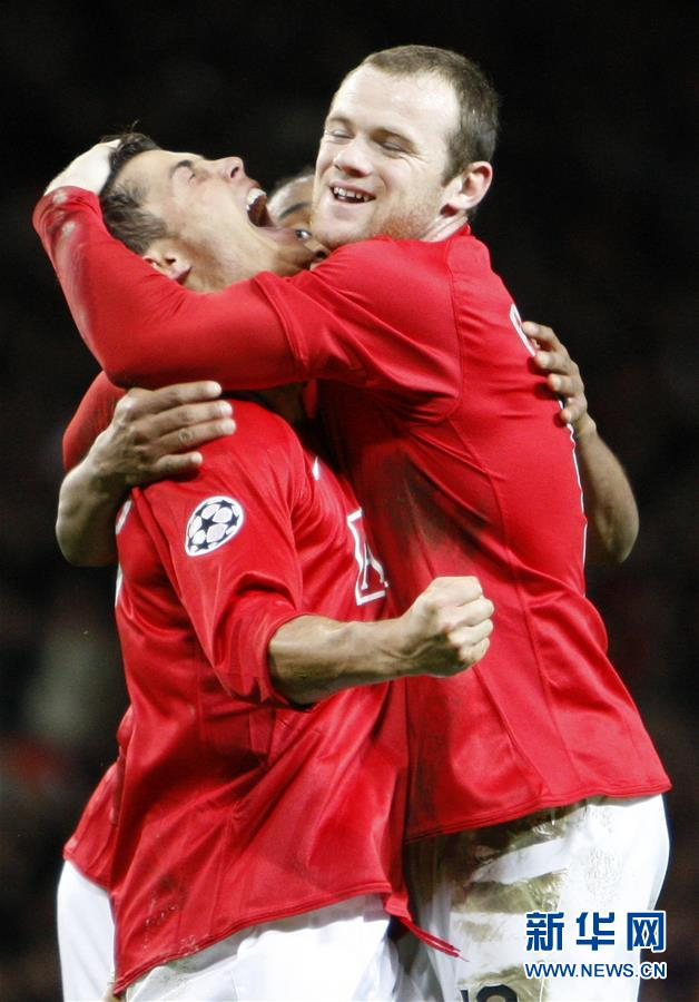 图为2008年3月4日,曼联队球员克 罗纳尔多(左)与队友鲁尼(右)等庆祝进球。当日,在2007-2008赛季欧洲冠军联赛八分之一决赛第二回合比赛中,曼联队主场以1比0战胜里昂队,晋级八强。新华社发