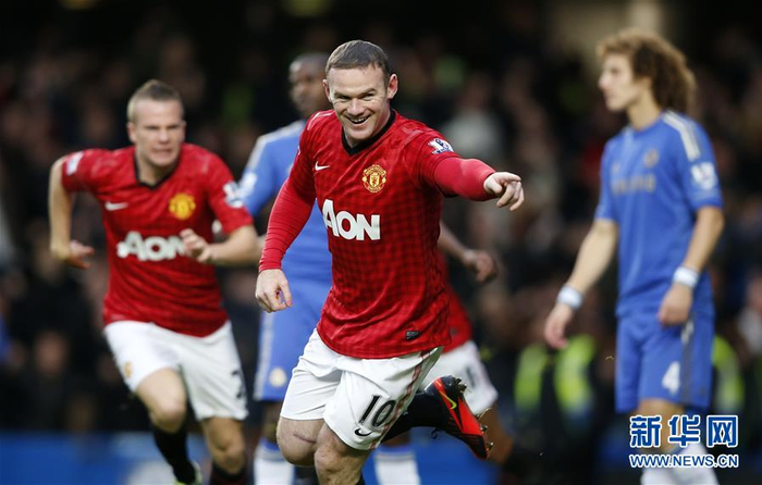图为2012年10月28日,曼联队球员鲁尼(前)庆祝切尔西队球员大卫·鲁伊兹(右一)的乌龙球。当日,在2012-2013赛季英格兰足球超级联赛第九轮比赛中,曼彻斯特联队客场以3比2战胜切尔西队。新华社记者 王丽莉 摄