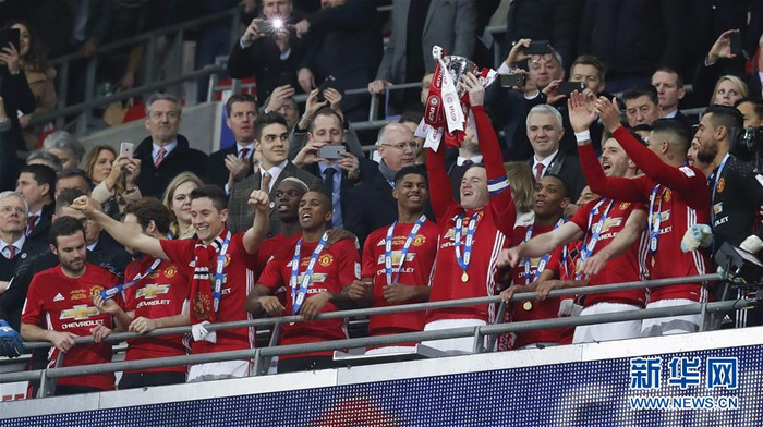 图为2017年2月26日,曼联队球员鲁尼在颁奖仪式上举杯庆祝。当日,在英国伦敦温布利球场进行的联赛杯足球赛决赛中,曼联队以3比2战胜南安普敦队,获得冠军。新华社记者 韩岩 摄