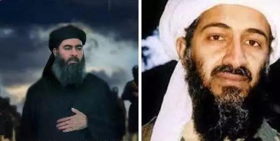 图中左为巴格达迪,右为“基地”组织前领导人本·拉丹。