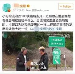这个视频说的是:一个美国洛杉矶街头的流浪汉,在获得了身为“路人”的一位美国视频博主Josh Paler Lin(中文名叫“林启晨”,系美国人)100美元的资助后,并没有按照很多人所以为的那样拿钱去烟酒超市酗酒,而是用这笔钱在店里买了食物,并分享给了其他流浪汉。