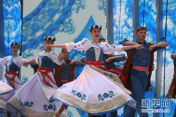 白俄罗斯舞蹈演员们在表演斯拉夫民族舞蹈。新华网记者魏忠杰摄