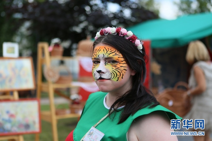 艺术节期间一名脸上涂了油彩的女孩走在维捷布斯克街头。新华网记者魏忠杰摄