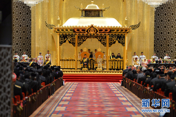 7月15日,在文莱斯里巴加湾市,文莱苏丹哈桑纳尔·博尔基亚和王室成员出席在努洛伊曼王宫举行的授勋仪式。新华网发(杰弗里·黄摄)