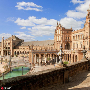 这个西班牙广场不是罗马的西班牙广场,西班牙广场是塞维利亚最容易辨认的建筑物,于1929年举办西美展览时修建,是摩尔复兴建筑风格的缩影。广场呈巨大的半圆形,建筑环绕着广场边缘,中心是一个大喷泉。墙壁上有许多壁龛,每个图案代表西班牙各省。西班牙广场经常出现在文学和影视作品之中。 (图片来源: juiceimages/东方IC)