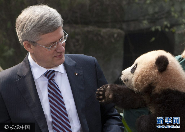 2012年2月11日,重庆动物园里,加拿大总理哈珀哈珀与大熊猫对望。哈珀此次访华期间,中方同意向加拿大提供一对大熊猫进行为期10年的合作保护研究。(图片来源:视觉中国)