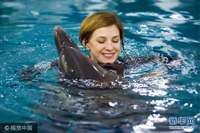 当地时间2016年3月15日,克里米亚辛菲罗波尔,克里米亚美女检察长娜塔莉亚·波克隆斯卡娅在水族馆中与海豚玩耍。(图片来源:视觉中国)