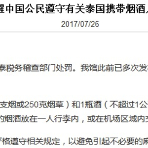 中国游客超量携带烟酒入境泰国遭罚 使馆再发提醒