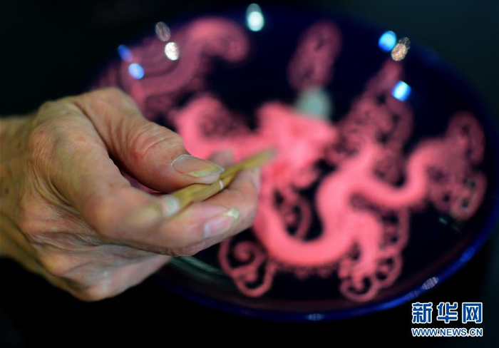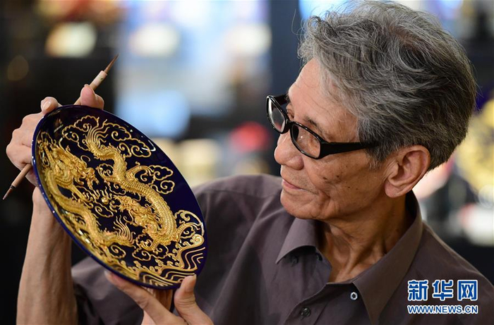 8月4日,厦门蔡氏漆线雕第12代传人、中国工艺美术大师蔡水况在展示贴好金箔的蓝底金龙盘。