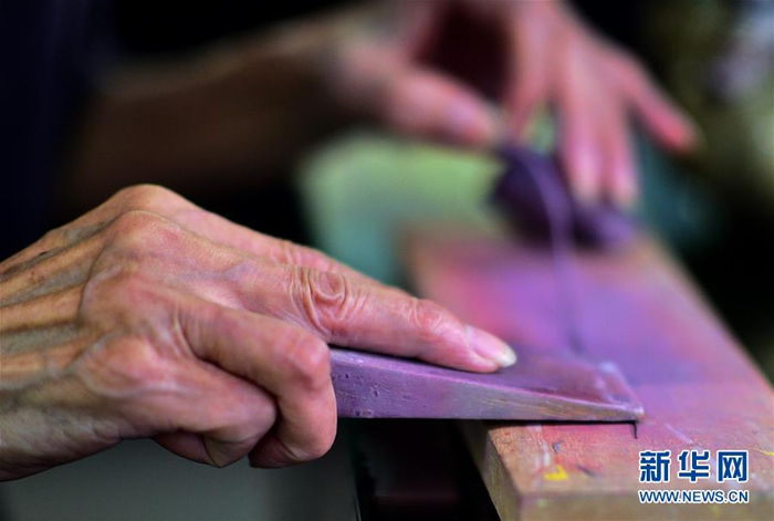 8月4日,厦门蔡氏漆线雕第12代传人、中国工艺美术大师蔡水况在搓漆线泥。他根据需要将其搓成粗细不同的漆线,搓好的细线缠在筷子或手指上,就可以开始盘绕图案。