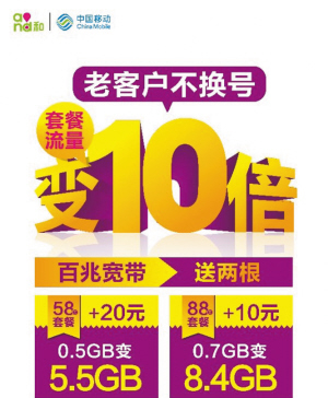 针对重庆移动老客户,重庆移动相关负责人告诉记者,重庆移动老客户不换号,每月最低加10元,套餐流量就可变10倍,百兆宽带送两根。比如58元套餐客户,每月加20元,即可套餐0.5GB流量升级为5.5GB流量,加10元/月再获得两根60M极光宽带;88元套餐客户,每月加10元,即可0.7GB流量升级为8.4GB流量,再送两根百兆宽带。更多档次及活动信息,市民不妨前往重庆移动各营业厅咨询了解。