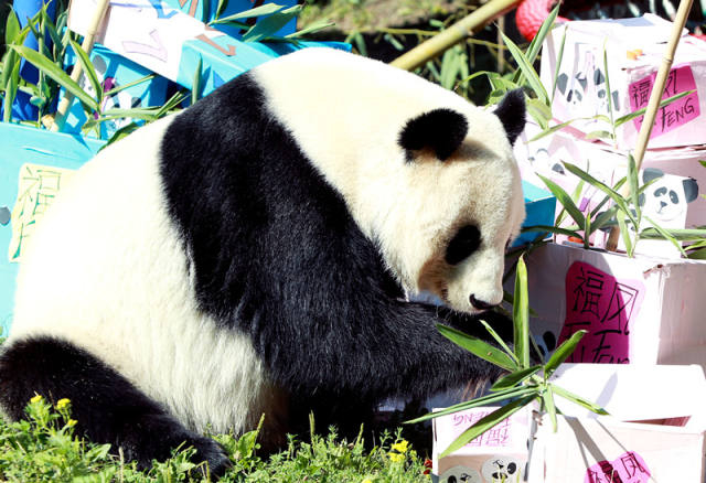 8月7日,在维也纳美泉宫动物园,龙凤胎“福伴”和“福凤”的妈妈“阳阳”在双胞胎周岁生日庆典上打开动物园准备的生日礼物。(新华社记者潘旭摄)