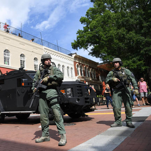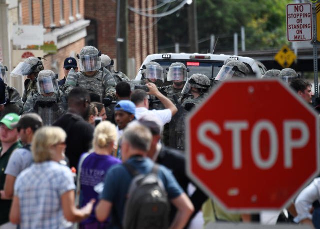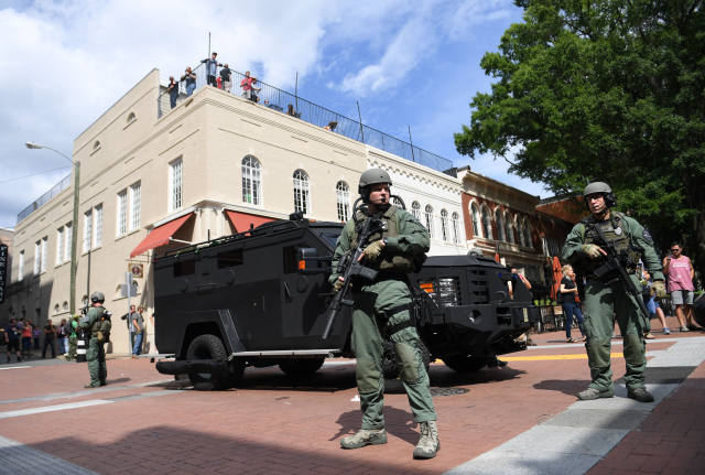 8月12日,在美国弗吉尼亚州夏洛茨维尔,执法人员在集会现场附近警戒。(新华社记者殷博古摄) 随着事态升级,弗吉尼亚州州长麦考利夫宣布夏洛茨维尔进入紧急状态。警方通过高音喇叭宣布民族主义者的示威活动违法,随后开始驱散人群。11时40分左右,约500名民族主义者和右翼示威者撤离了解放公园。而另一方抗议的人群未离开,大部分人往市中心方向行进。